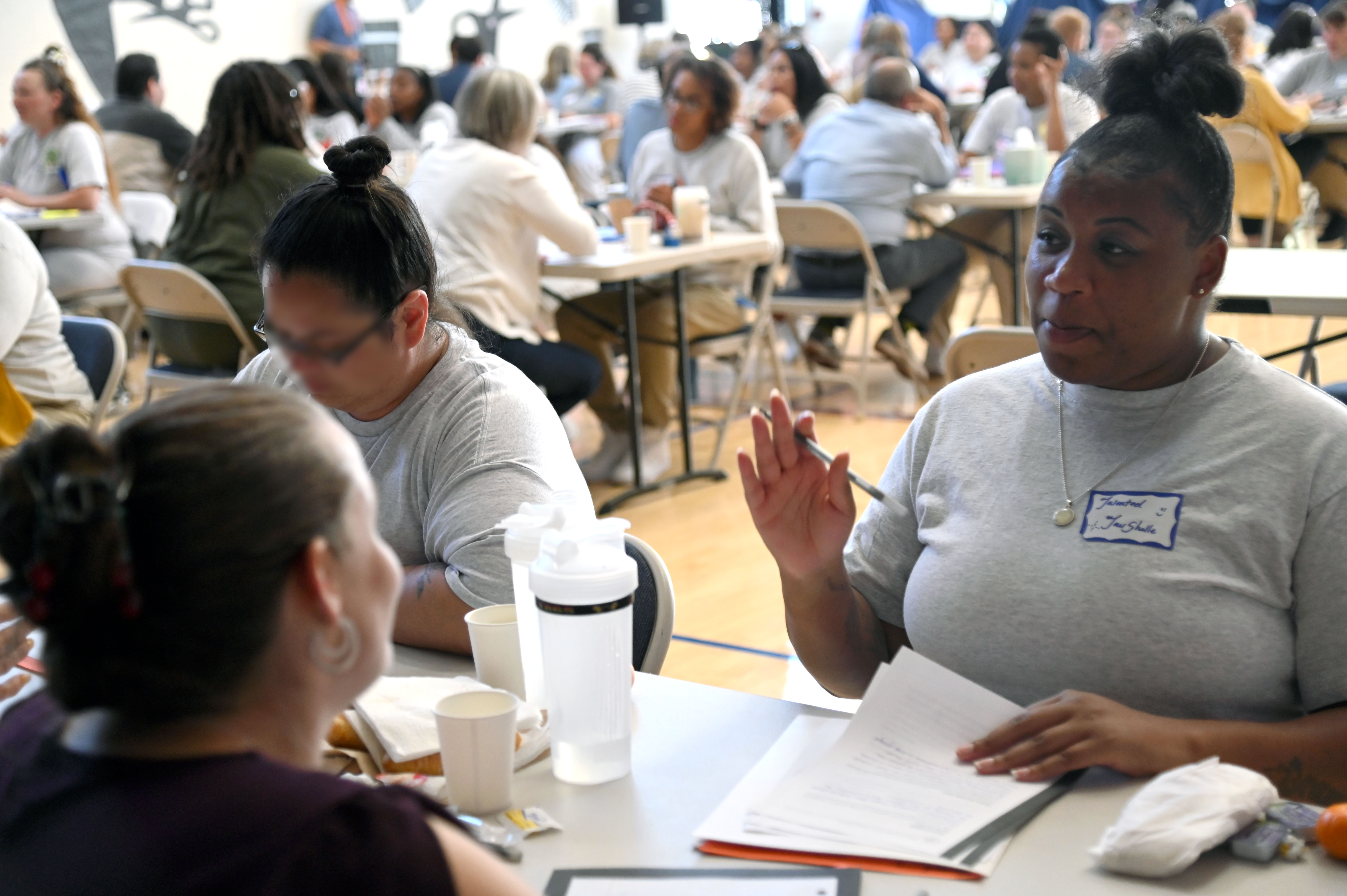 GIG HARBOR—Inside the fluorescent-lit gymnasium behind prison gates, 34 incarcerated women gathered at tables at Washington Corrections Center for Women (WCCW). Dressed in standard-issue gray t-shirts and khaki pants, the women clutched their resumes and mock business plans with a mix of nervous energy and cautious hope. Across from them sat their coaches—business professionals volunteering from the outside world. Some dressed in blazers, others more casually. The coaches leaned in, offered feedback and asked thoughtful questions about business concepts.